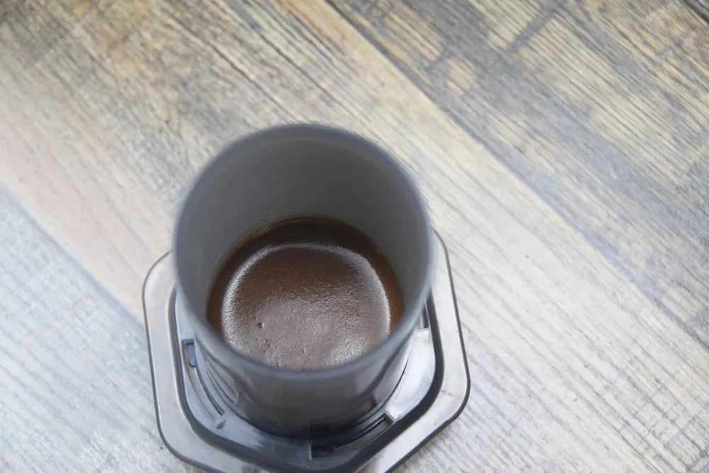 2. Attach to your press [Aeropress / Yuropress ETC] then Tighten the prismo and the filter cartridge by twisting it on., put 20g of fresh ground coffee or your recomended recipe for your specialty beans tap the barrel of the press, and place the filter cartridge on the container. (Note: ceramic cups or sturdy vessels are recommended for containers, the caliber / diamiter of the vessel should not be too small)