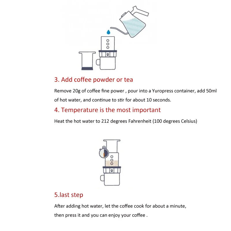 3. Fill 50ml of water, stir for about 10 seconds, then let stand, soak for 30 seconds to one minute to press it. add the amount of water to your desired level as per your recipe. (The appropriate tempreture is around 95-100 drgrees you can also pre heat the press to help reduce heat loss..)